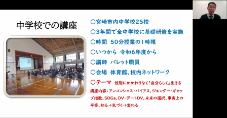 宮崎市男女共同参画センター「パレット」センター長の椎木隆さんから、センターを軸とした地域への事業展開について、啓発のポイントや様々な地域団体、学校・保育施設、企業等と連携して進めることの意義が語られ、短期で成果を出そうとするのではなく、一歩一歩継続した取組が重要であるというメッセージが送られました。