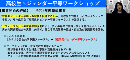 福岡県男女共同参画センター「あすばる」センター長の野田律子さんより、若者のジェンダー平等理解促進事業として実施している『高校生×ジェンダー平等ワークショップ』について、そのプロセスや運営面で苦慮した点を含めて、得た成果や今後に向けての検討課題を報告していただきました。