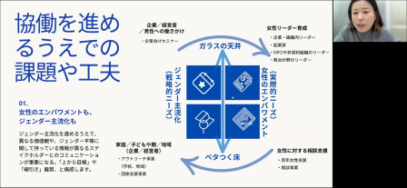 札幌市男女共同参画センター係長の菅原亜都子さんより、営利セクターと非営利セクターの協働でジェンダー平等を目指すプラットフォーム「ジェンダー・コレクティブ北海道」の事業について報告していただき、連携・協働する過程で派生してくる課題への対応策等、事務局としてコーディネートに必要な視点をご教示いただきました。