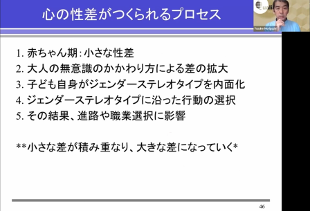京都大学で心理学・脳神経科学の見地から子どもの発達を研究している教授の森口佑介さんから、乳幼児期からの性差を詳細に分析した研究成果をもとにご報告いただきました。年齢とともに性差が拡大する要因に着目することで、親や教師の接し方や期待によって、子どもにジェンダーが内面化される過程を明らかにし、ジェンダー・ギャップを再生産しないための方策として、大人が自分自身の無意識な行動を振り返り点検すること、子どもの性別ではなく個性を尊重することの意義を学びました。