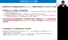 学校は、次代を担うこどもたちが、男女共同参画、ジェンダー平等推進に向けた意識を育む基盤となる重要な場であるにも関わらず、教職員の問題意識の持ち方や地域・学校ごとの取組の差によって、こども達の個性や選択肢が制限されている現状があり、未だジェンダー平等に資する実践が充分とはいえません。各講師は、こども達はもちろん教員も一人ひとりが尊重され、性別等に関わらず、能力を発揮することのできる環境整備の必要性と意義について、専門領域を基点に言及し、受講者はジェンダー平等を進めていくために必要な視点とは何かを考え、各組織や地域での取組を加速していくための手掛かりを得る機会としました。
