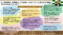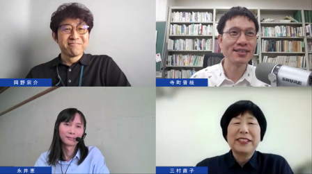 前半は、船橋市立宮本学校教諭の永井恵さんから「多様性を尊重した学校づくり」について、岡山県立倉敷鷲羽高等学校前校長の三村直子さんからは「『なぜ女性校長は少ないのか』研究報告」について、そして、三重県教育委員会事務局教職員課小中学校人事班班長の岡野宗介さんからは「三重県の女性管理職登用の施策」について、各々の経験や取組を進める中での気付きについてお話しいただきました。後半は、宮崎公立大学人文学部准教授の寺町晋哉さんをコーディネーターに、質疑応答を交えて意見を交わし、学校を誰もが輝ける場にしていくために必要な視点と実効性のある方策について討究しました。