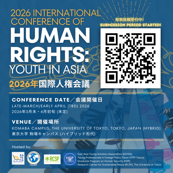 この度、Young Professionals in Foreign Policy 東京(外交政策の若手プロフェッショナル東京支部)は四度目の人権会議「2026年度国際人権会議:アジアの若者たち(International Conference on Human Rights: Youth in Asia)」を、東アジア若手学術協会、東京大学大学院総合文化研究科「人間の安全保障」プログラム及び東京大学大学院総合文化研究科付属グローバル地域研究機構 持続的平和研究センターと共催することになりました。東アジアおよび世界全体の人権の推進のためには若者を人権課題に関する議論に巻き込むことが不可欠です。
